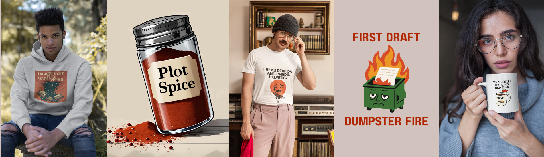 Wearables and accessories for the wordsmith—elevated, provocative merch designed by writers, for writers. Because creativity is messy, weird, wonderful—and you look great in it.
